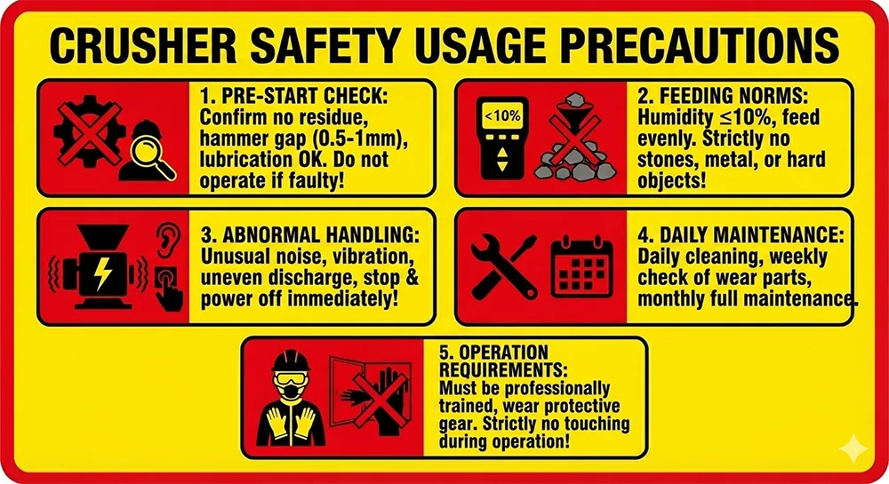 قبل البدء، تحقق مما إذا كان هناك أي مادة متبقية في غرفة التكسير، ثم تحقق من الفجوة بين رأس المطرقة ولوحة البطانة، والتي يجب التحكم فيها بين 0.5-1 مم. وفي الوقت نفسه، تأكد مما إذا كان مستوى الزيت في نظام التشحيم كافيًا وما إذا كان خط الأنابيب خاليًا من العوائق. إذا تم التحقق من كل ذلك ولم تكن هناك أي مشاكل، فقم بتشغيل الجهاز.